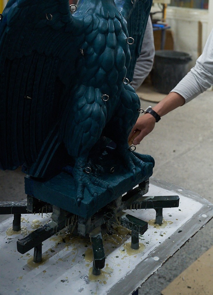 Les œuvres en cire sont assemblées grâce à des alimentations (jets, évents, masselottes) qui forment une grappe, aussi appelée arbre de coulée. Ce montage peut réunir plusieurs pièces ou fragments d’une sculpture. Il répond à des règles précises de fonderie à la cire perdue : orientation de la pièce, sens de coulée, circulation du métal, évacuation des gaz et prévention des retassures. L’objectif est d’assurer un remplissage complet du futur moule et une coulée régulière, même dans les détails les plus fins.
